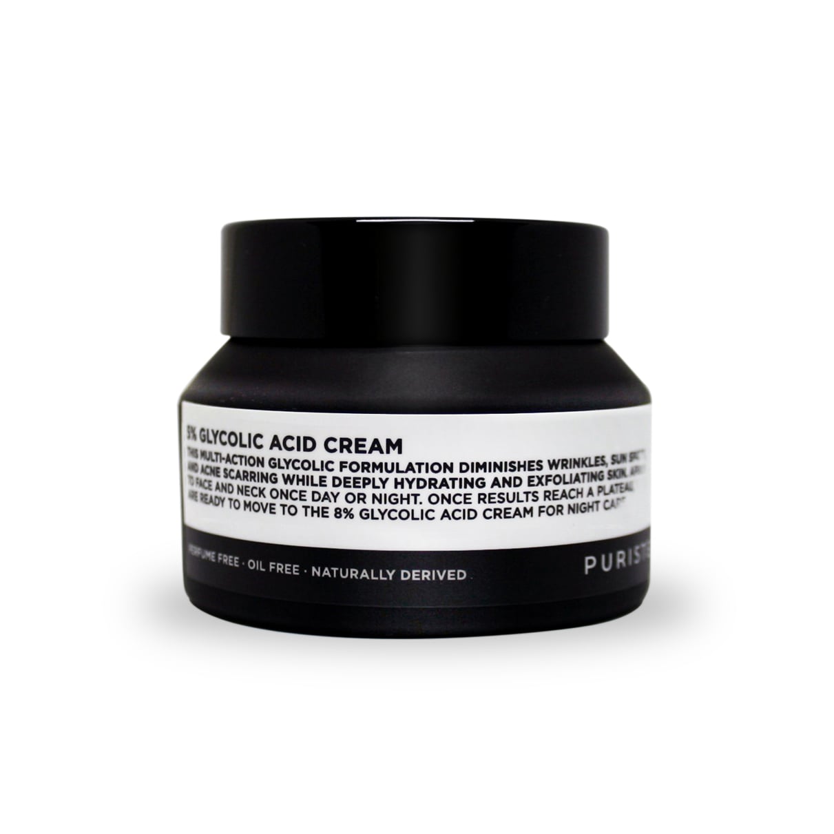 The second step of the Puriste glycolic acid stepwise system, our 5% Glycolic Acid Cream is the quintessential all-in-one skincare product. The pharmaceutical-grade acid in this formulation works to gently exfoliate the skin. Dead skin cells are loosened, which allows for the nourishing, vitamin-rich botanicals found in this product to deeply penetrate the lower layers of fresh skin with a multitude of skin beneficial properties. Benefits include diminishing the appearance of wrinkles and acne scarring, lifting and firming skin through increased collagen production, brightening dull skin tone, stimulating new fresh skin cells, replenishing moisture, and diminishing skin discolouration including brown spots.